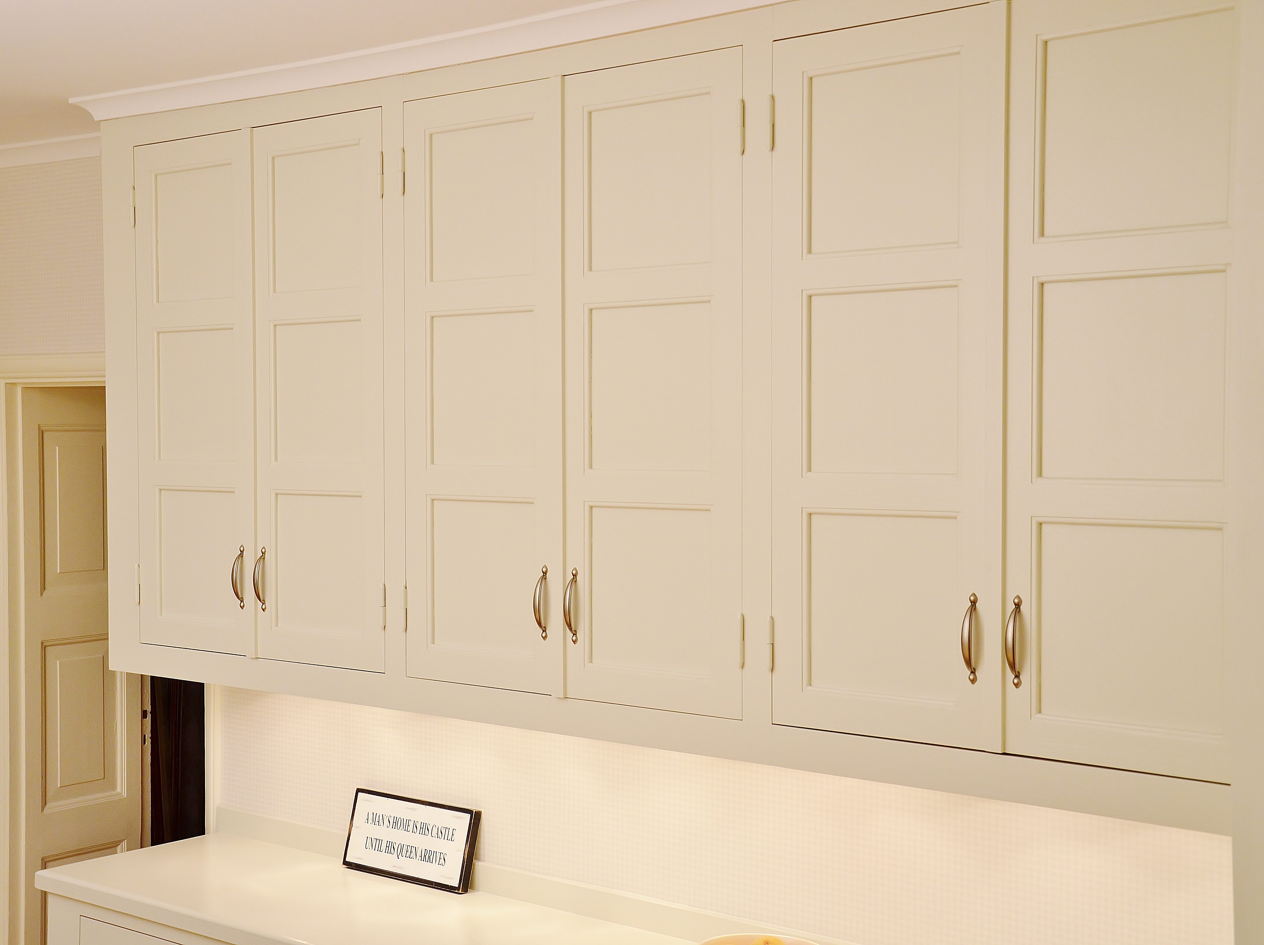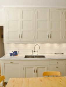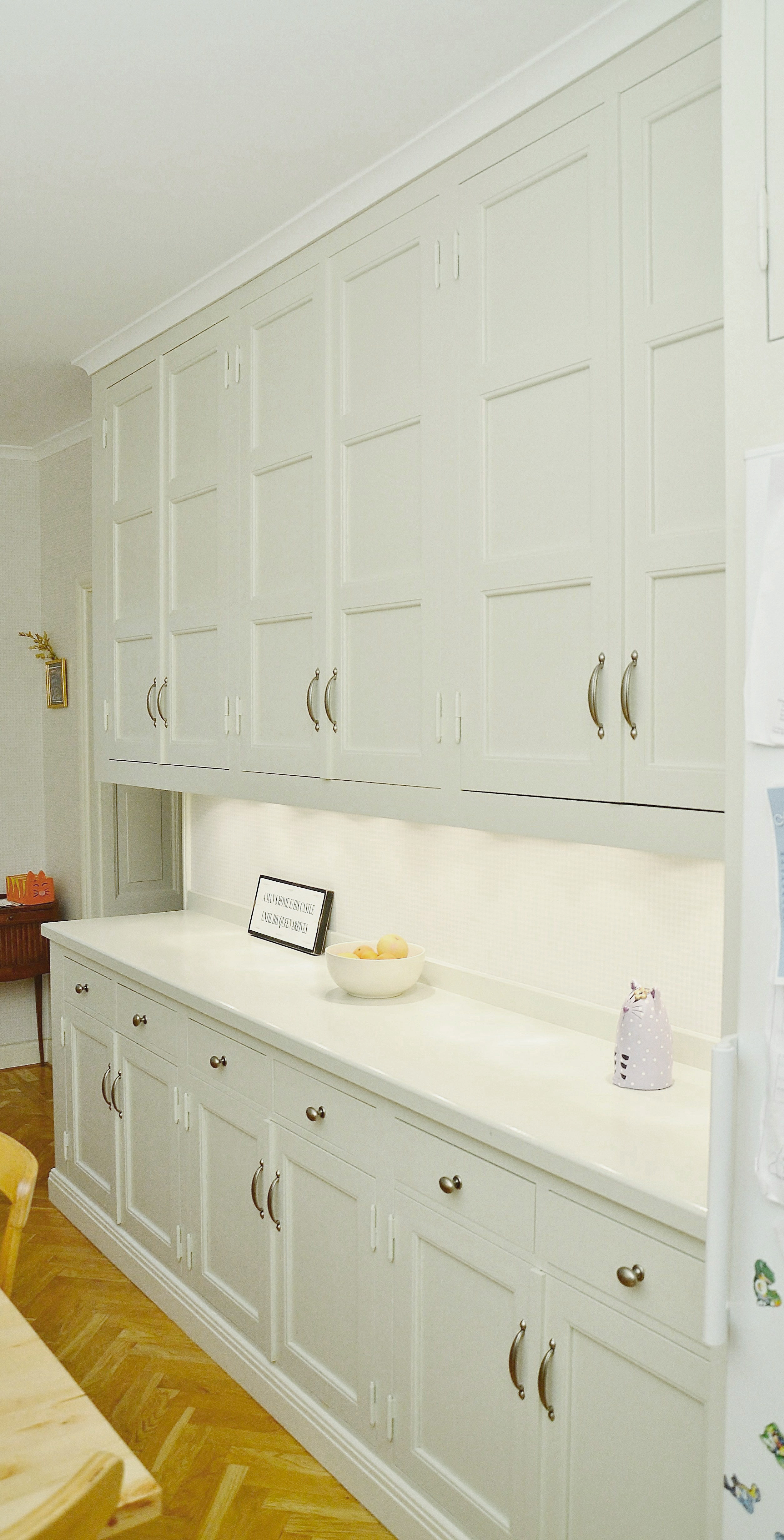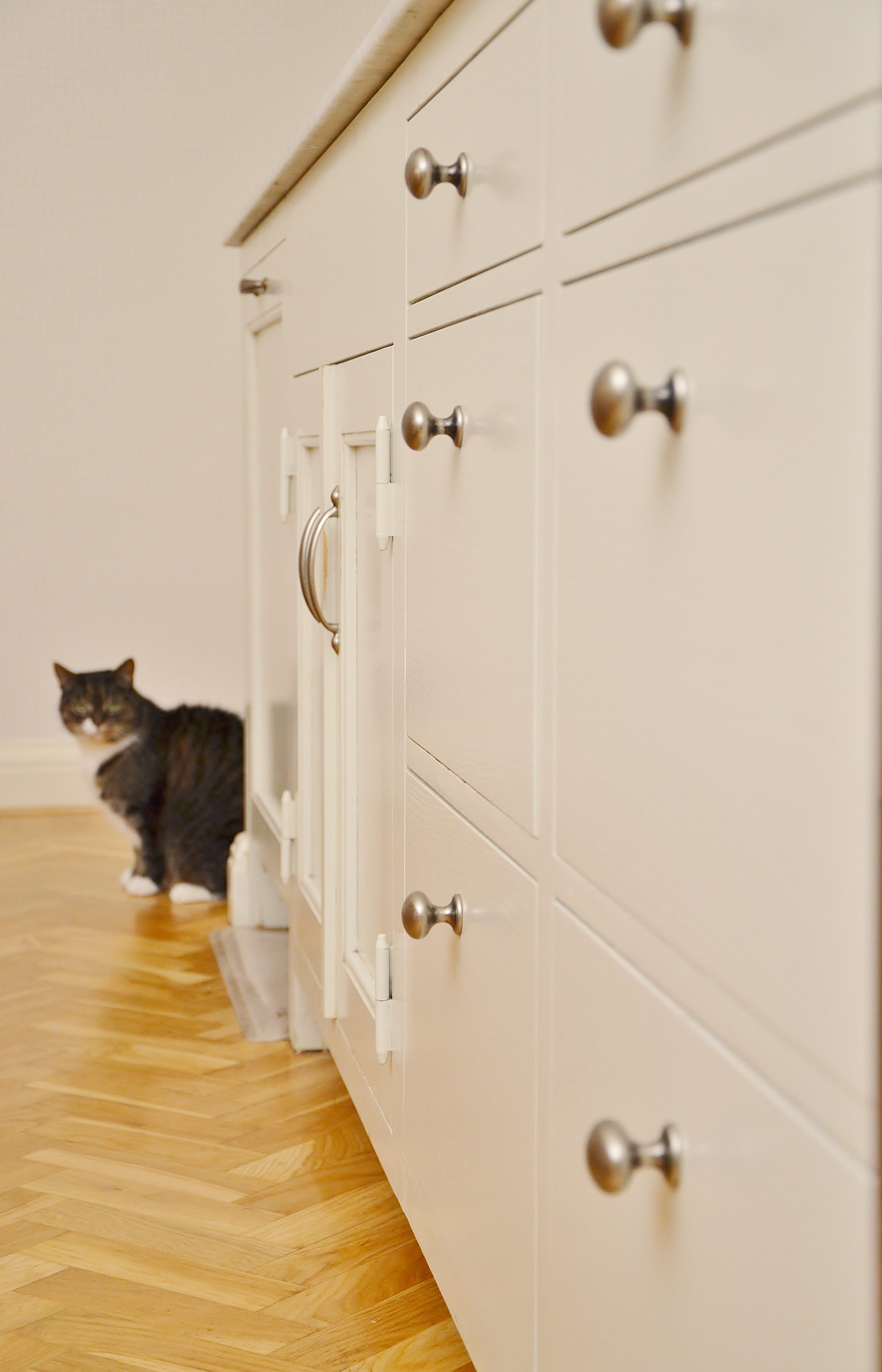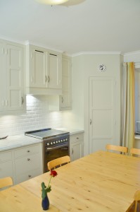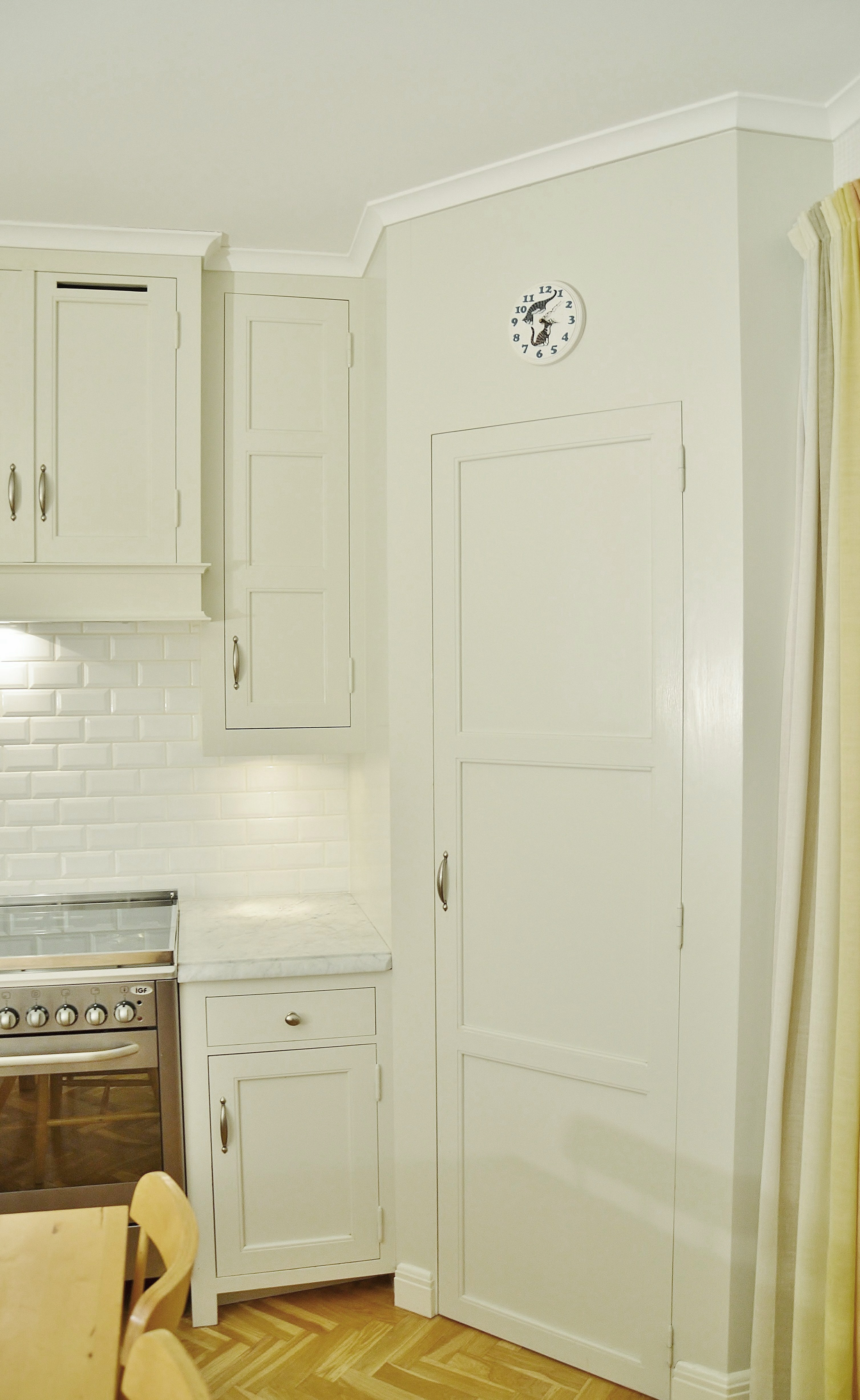 Snickerier i massiv furu är målade i NCS S‑1000N. Överskåpens dörrar är tredelade med förebild i lägenhetens originalskåp, kompletterade med överfalsande list mellan pardörrarna enligt traditionellt utförande.