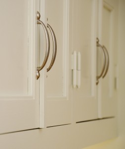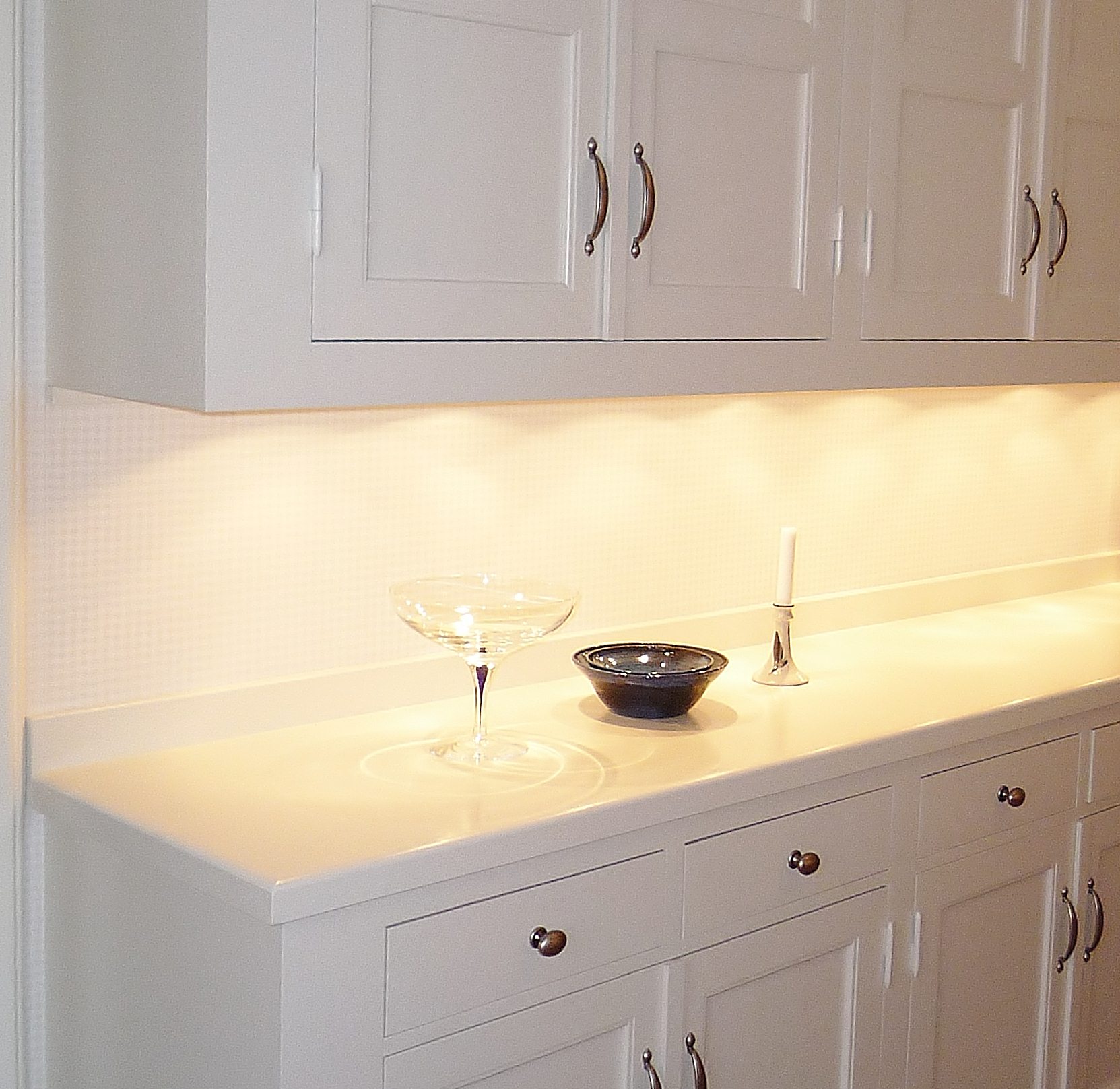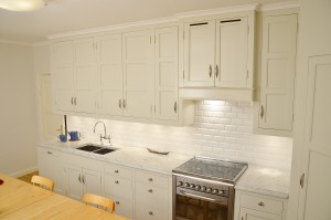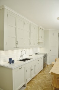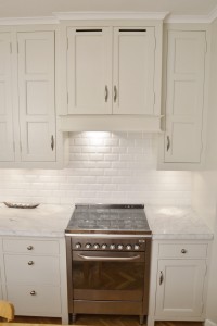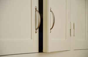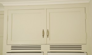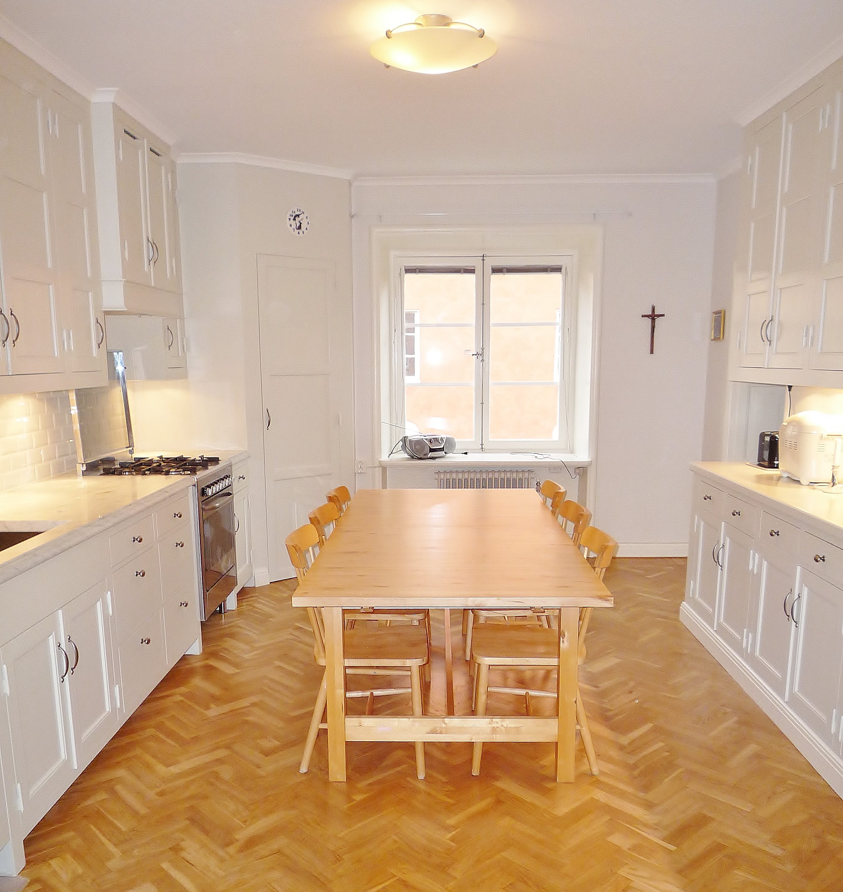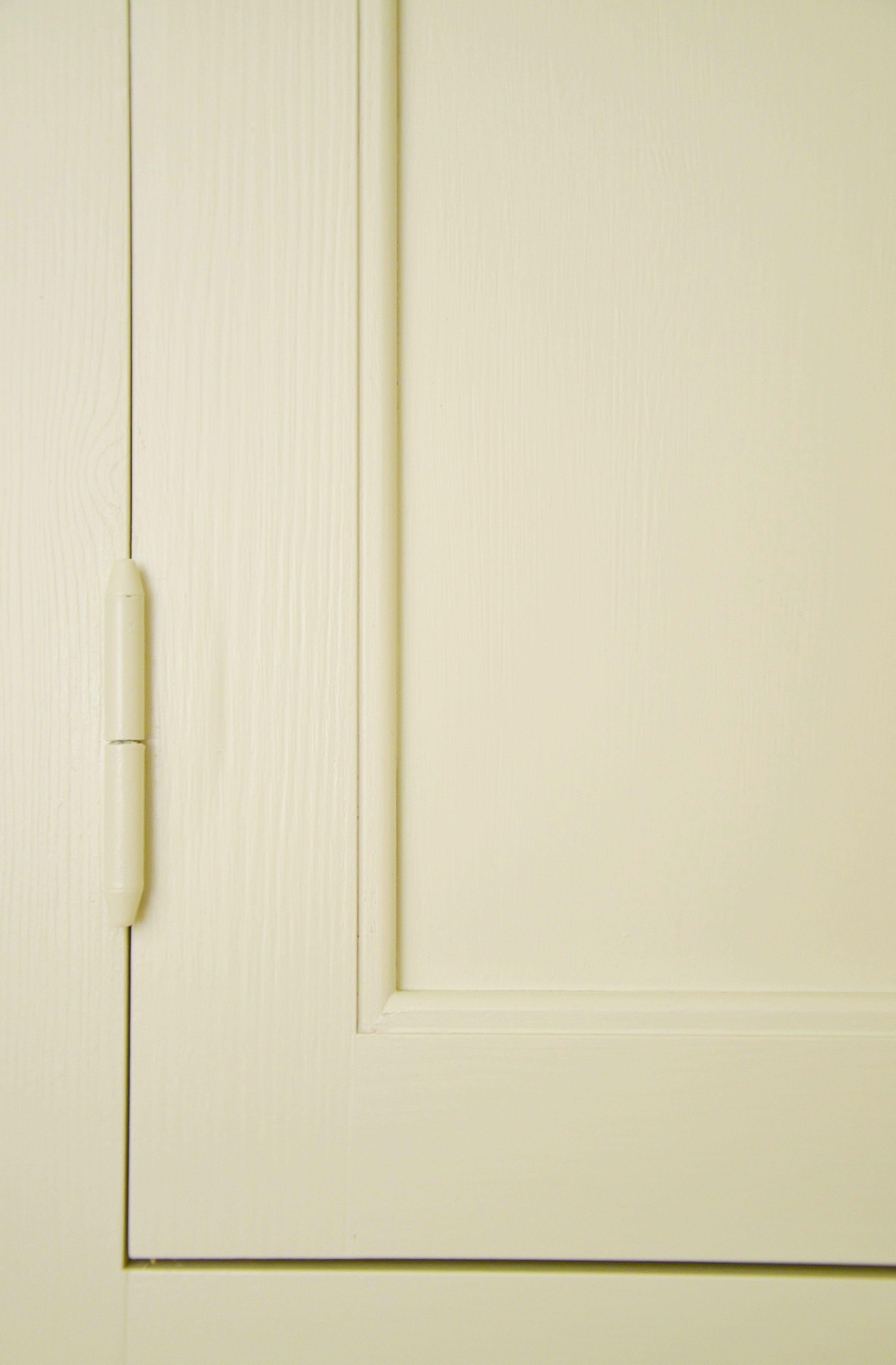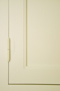 Snickerier i massiv furu är målade i NCS S‑1000N. Överskåpens dörrar är tredelade med förebild i lägenhetens originalskåp, kompletterade med överfalsande list mellan pardörrarna enligt traditionellt utförande.