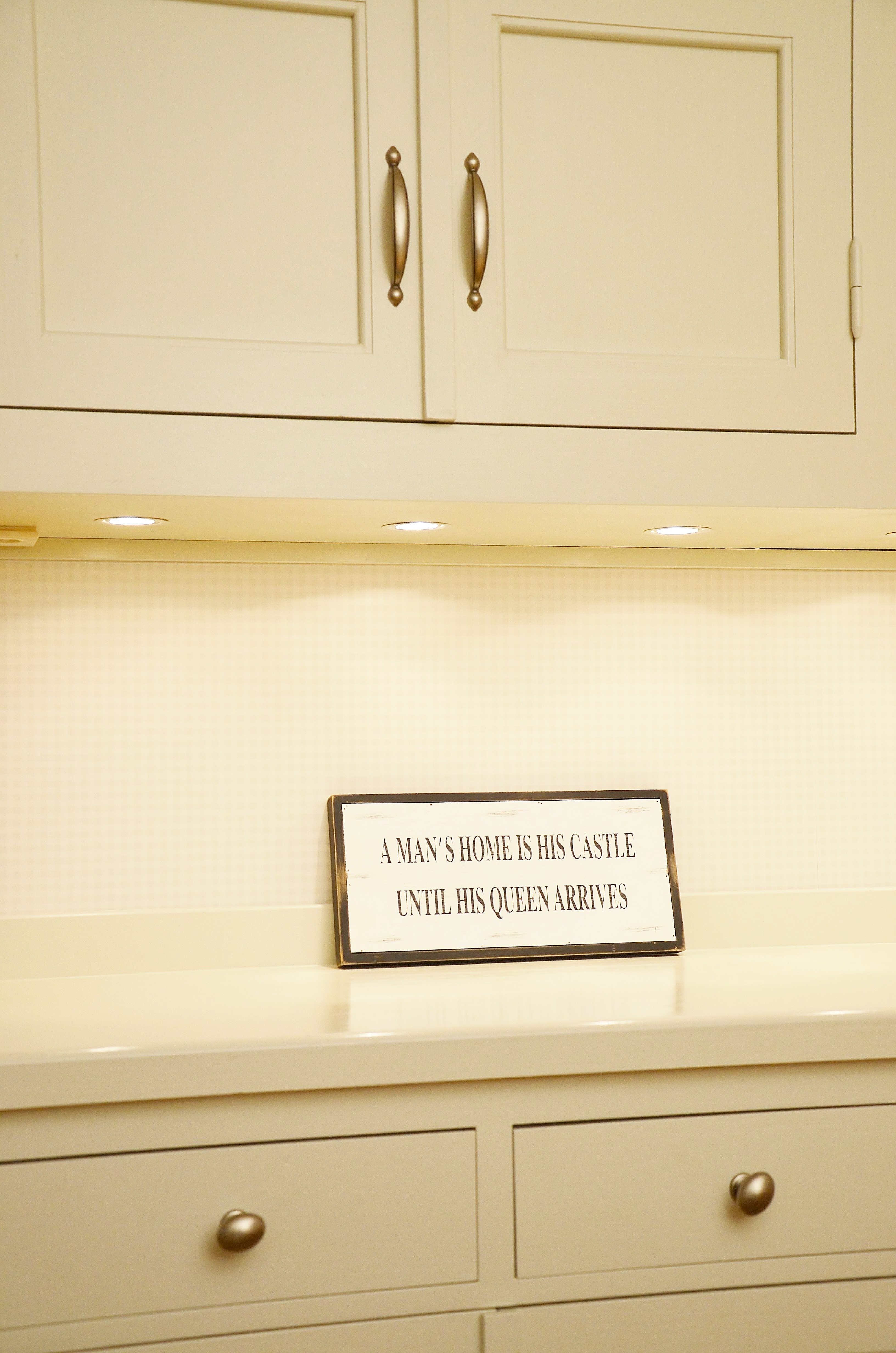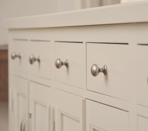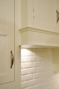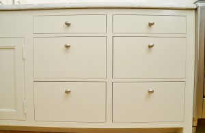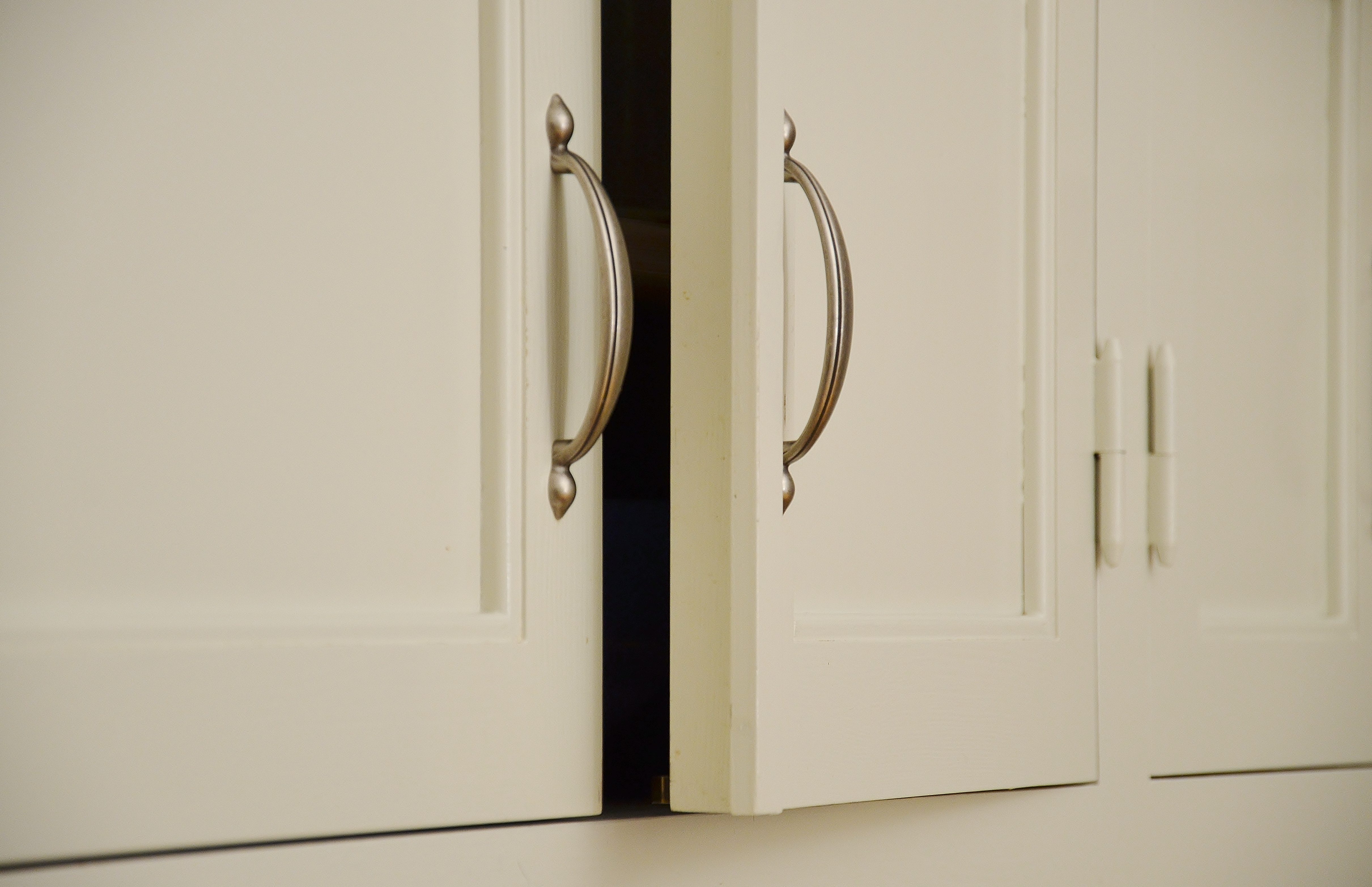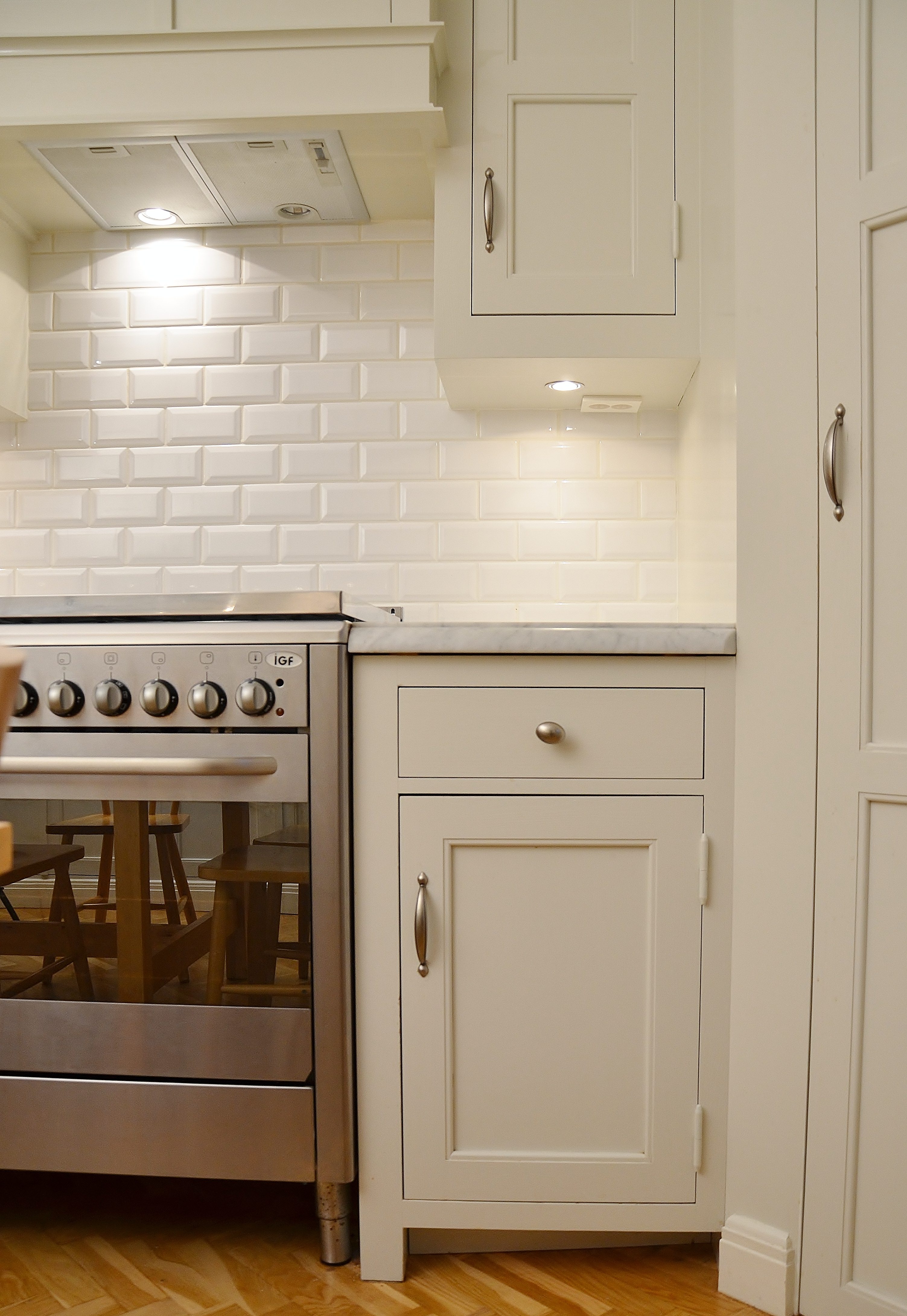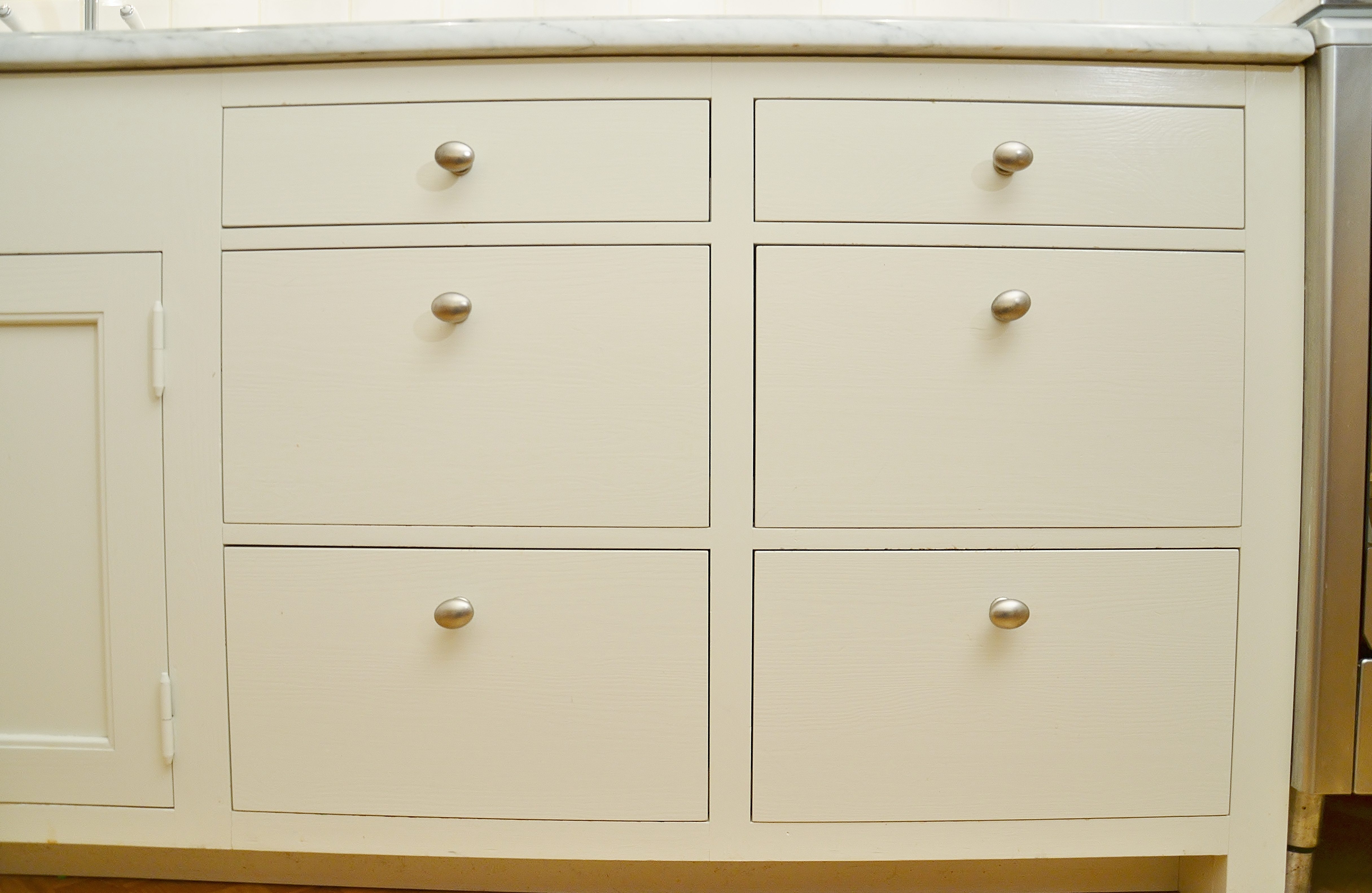 Snickerier i massiv furu är målade i NCS S‑1000N. Överskåpens dörrar är tredelade med förebild i lägenhetens originalskåp, kompletterade med överfalsande list mellan pardörrarna enligt traditionellt utförande.