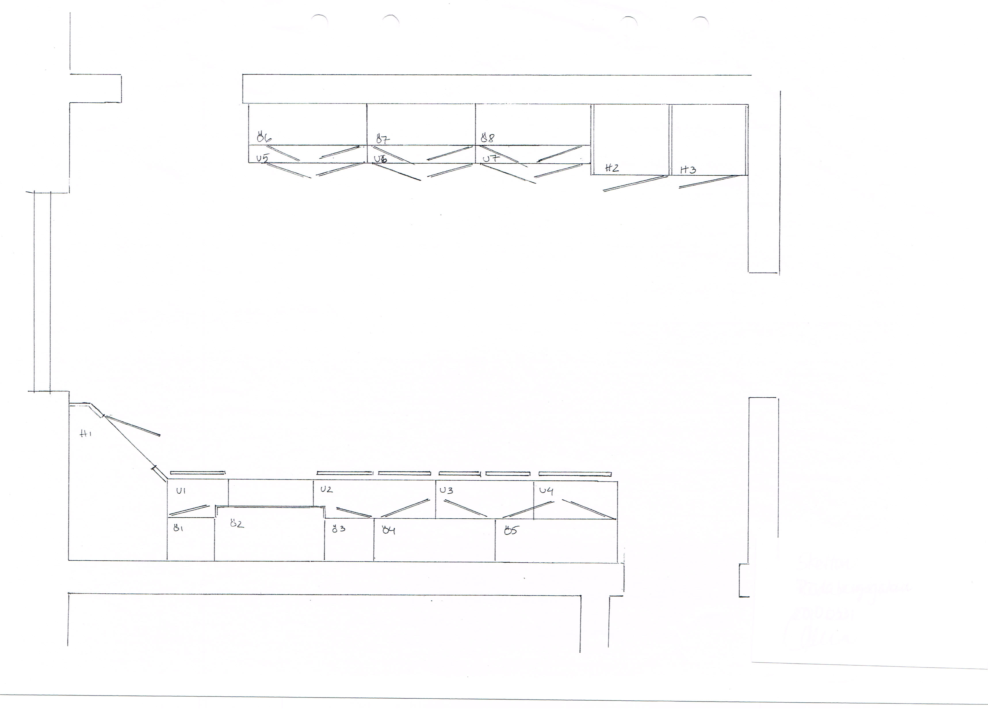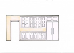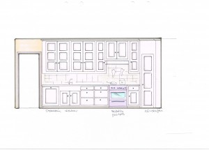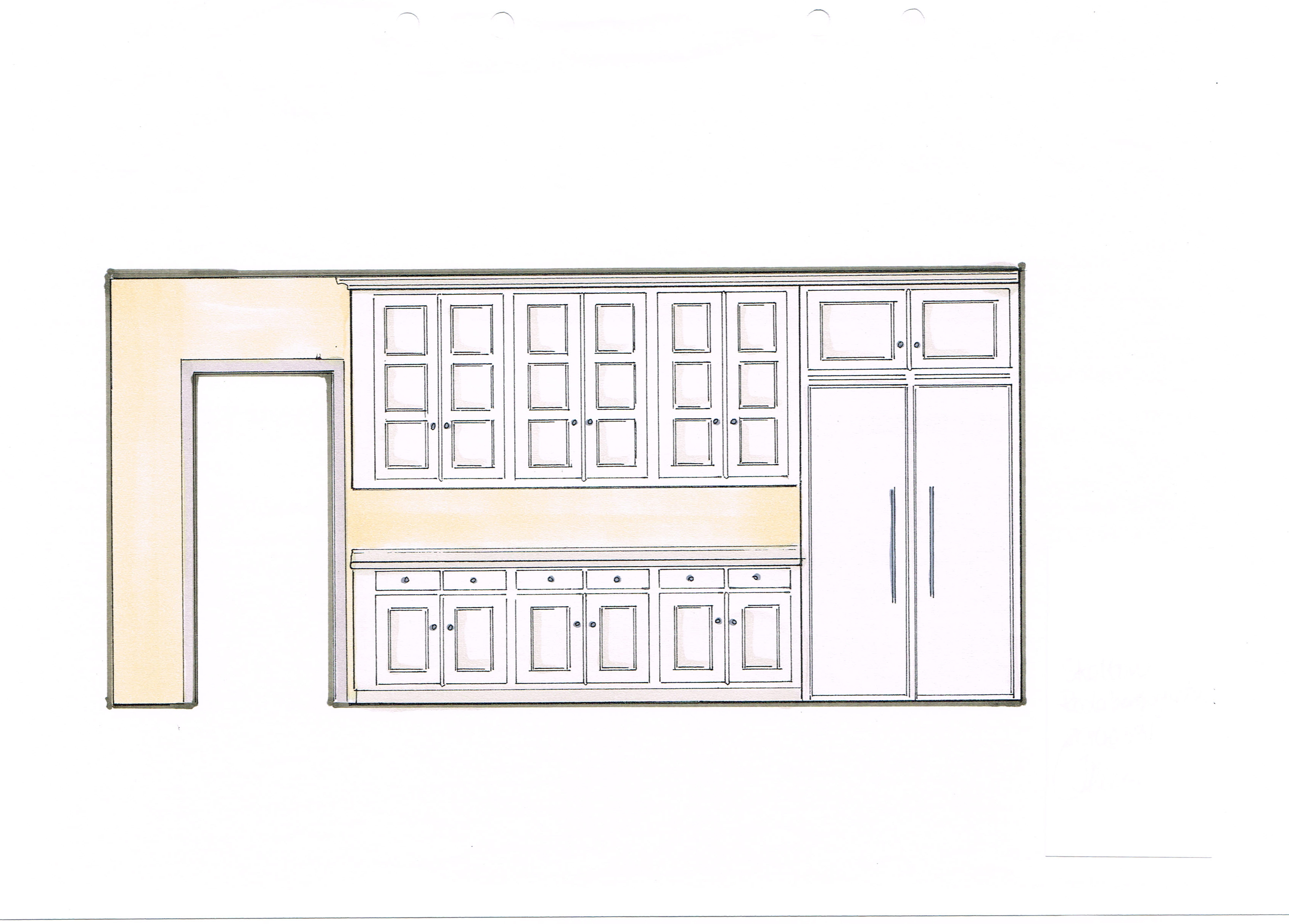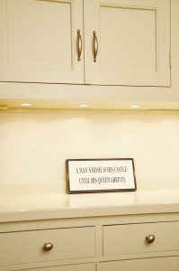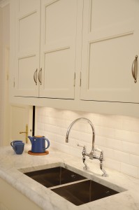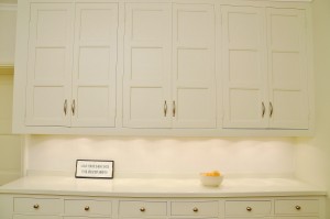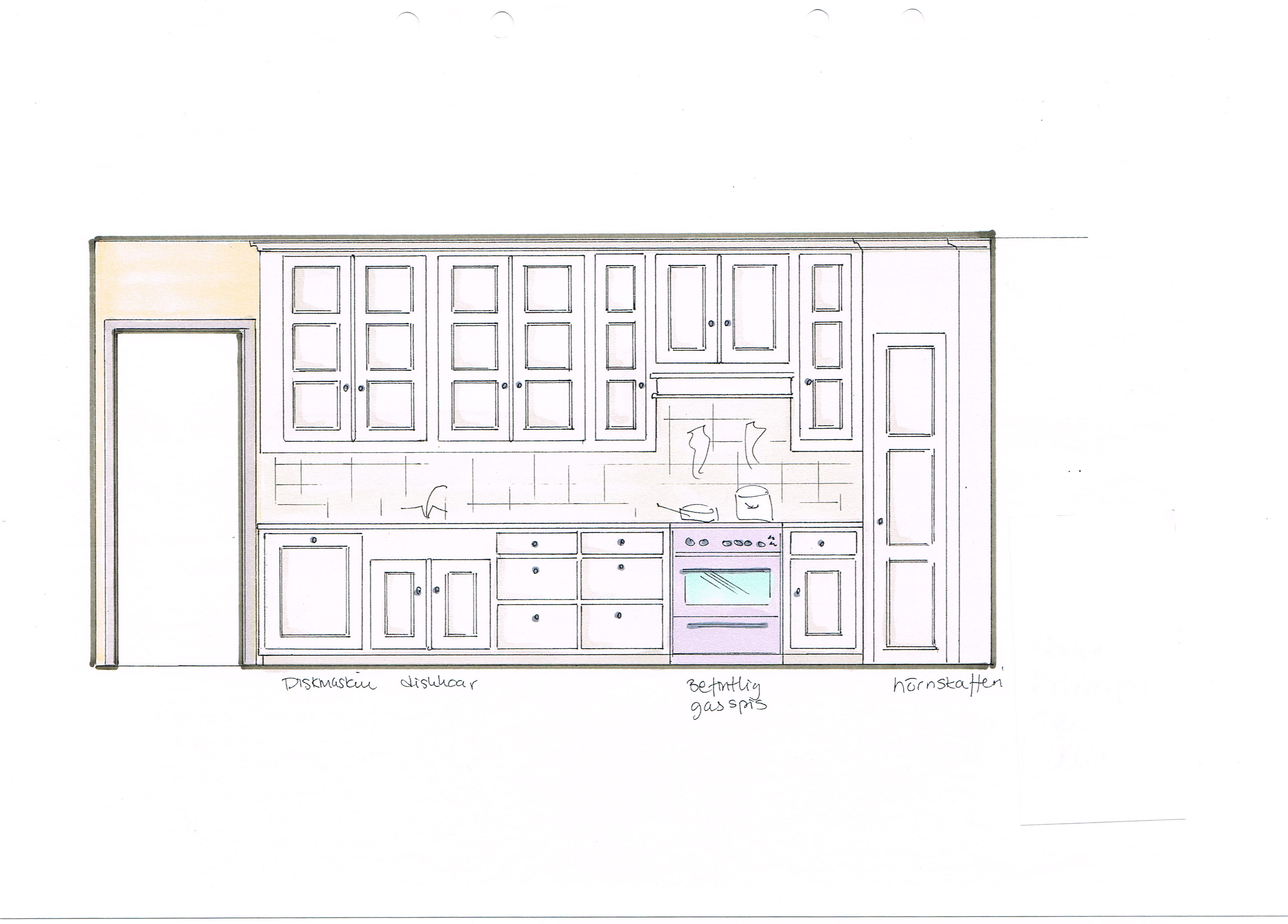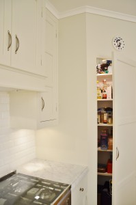 Det tidigare köket i rummet intill innehöll ett platsbyggt originalskafferi, vilket togs till vara och anpassades till tvättstuga när det nya köket, med sitt hörnskafferi, uppfördes.