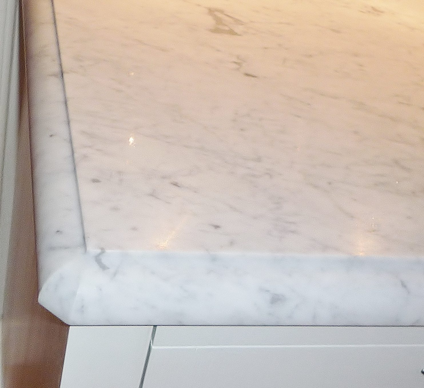 Bänkskivor i 40 mm carraramarmor samspelar med blandare Horus, Victoria 19.141 från Badex. Golven är original – fiskbensparkett i ek – och bidrar till rummets kontinuitet och självklarhet.