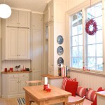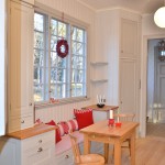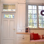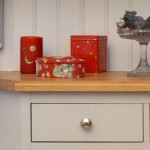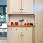Måttanpassade kökssnickerier i genomgående massiv furu, handmålat med linoljefärg från Wibo färg S1502Y, varmgrå.