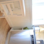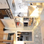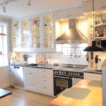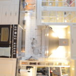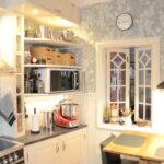 Kök i genomgående massiv furu, handmålat på plats i bruten vit kulör. Snickerierna är utförda med omsorg om proportioner och detaljer, anpassade efter rummets förutsättningar och husets karaktär.