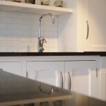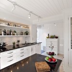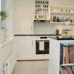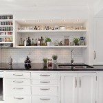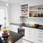Hyllorna ovanför köksbänken fungerar som ett närskafferi och ger enkel tillgång vid matlagning. I skänkskåpen till höger och vänster finns plats för micro, matberedare, kaffebryggare, vattenkokare och brödrost – samtliga inkopplade och redo att användas.